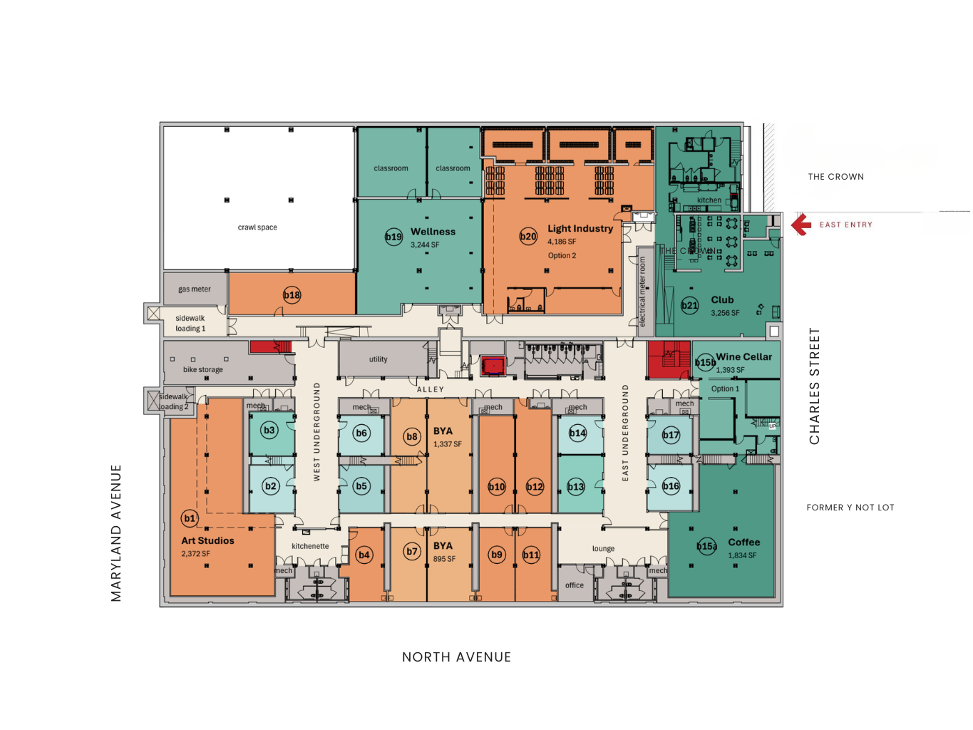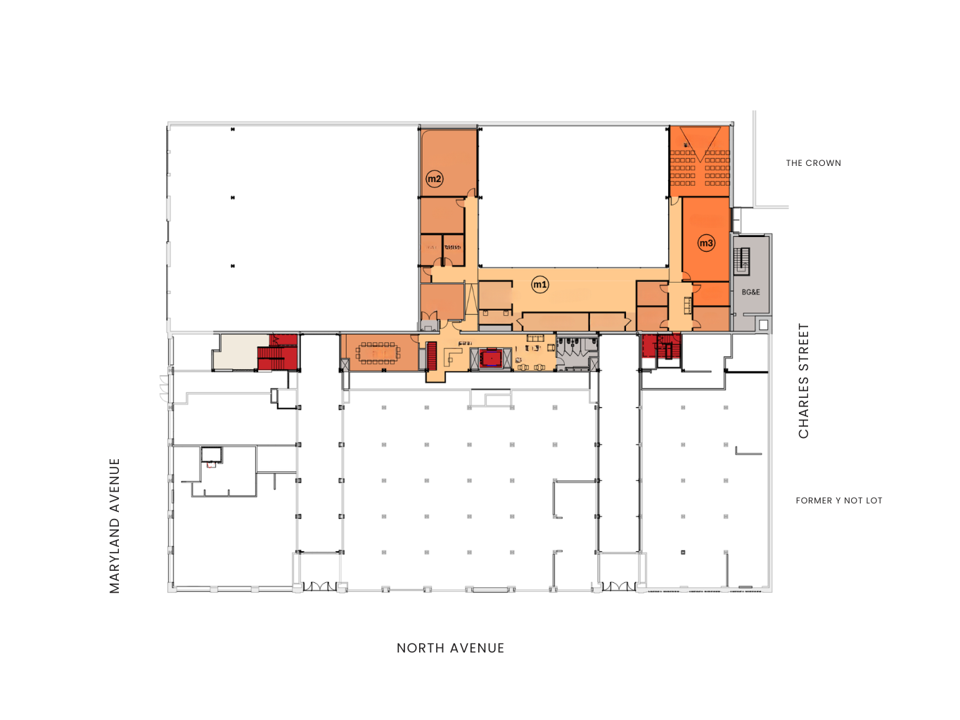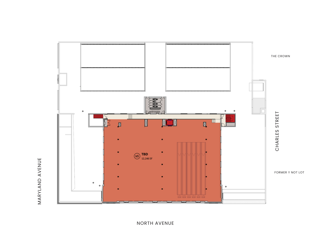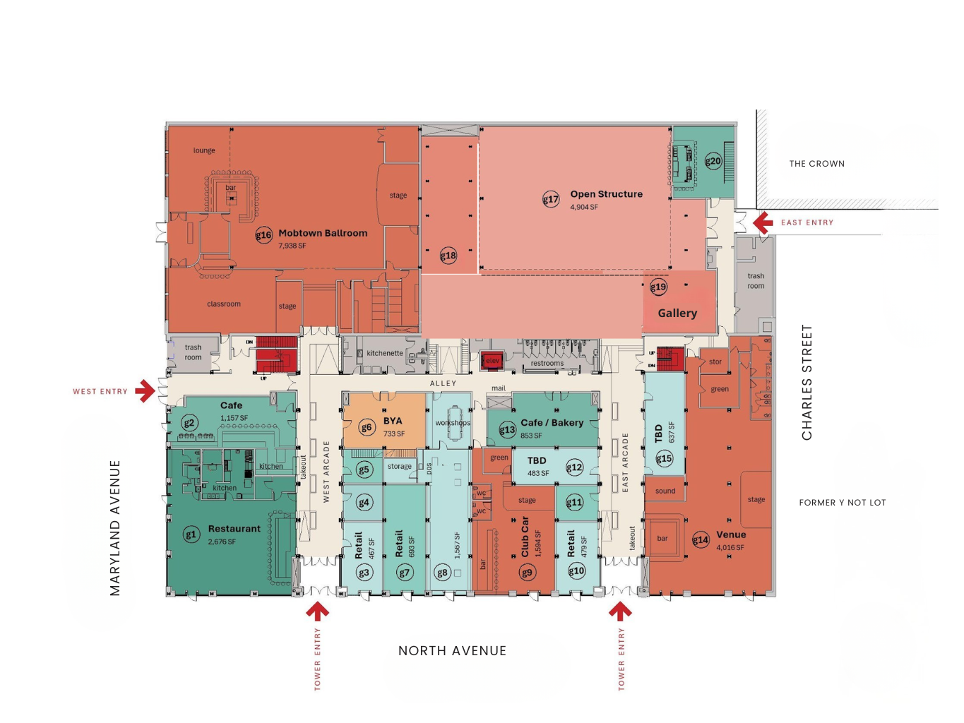 North Avenue will have two entrances at the West and East Arcade and a third entrance at Maryland Avenue to enter the central arcade. A fourth entrance is in the works on the east side of the building along Charles Street between the former Y Not Lot and The Crown.
