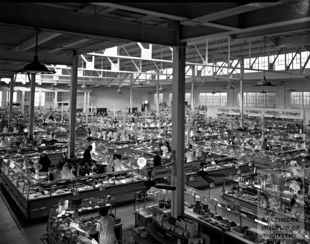 North Avenue Market was built in 1928 as Baltimore City’s first privately-owned market house. When it opened, the market contained twelve retail stores, a twenty-two-lane duckpin bowling alley, and over 200 grocery vendors. The market’s commercial viability was impacted by demographic changes following WWII, including the exodus of Baltimore residents to the suburbs. In 1968, a fire substantially damaged the interior of the building. Shortly after, the northern portion of the building was razed to accommodate the construction of J Van Story apartments.