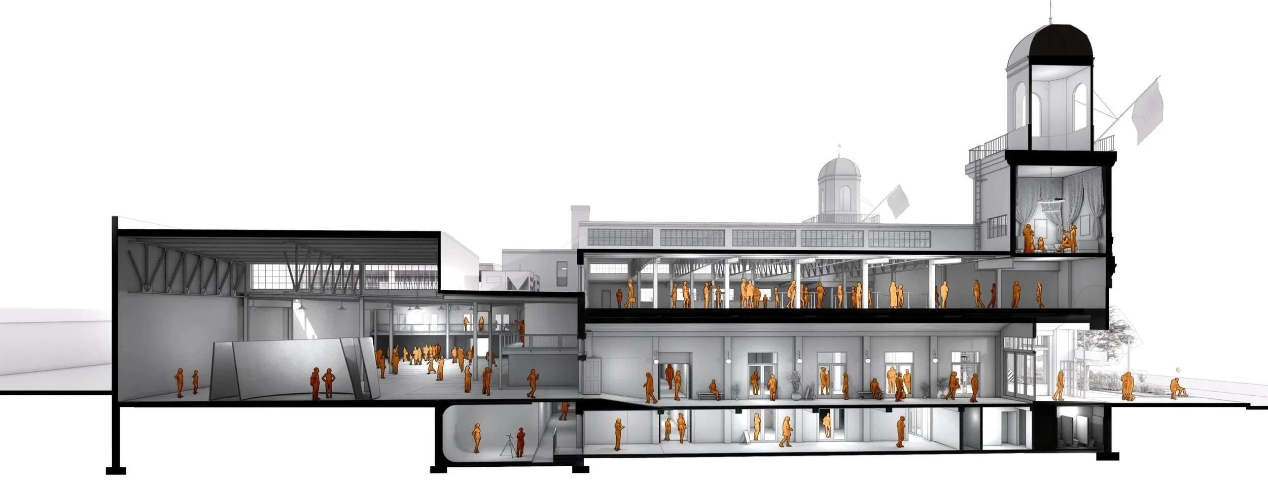 Surrounding this space are a series of mezzanine-level and adjacent studios operated by mission-aligned partners, including an arts college program and a nonprofit serving youth through creative education. This space will host dozens of community events annually at no cost and attract an estimated 14,000+ visitors annually.