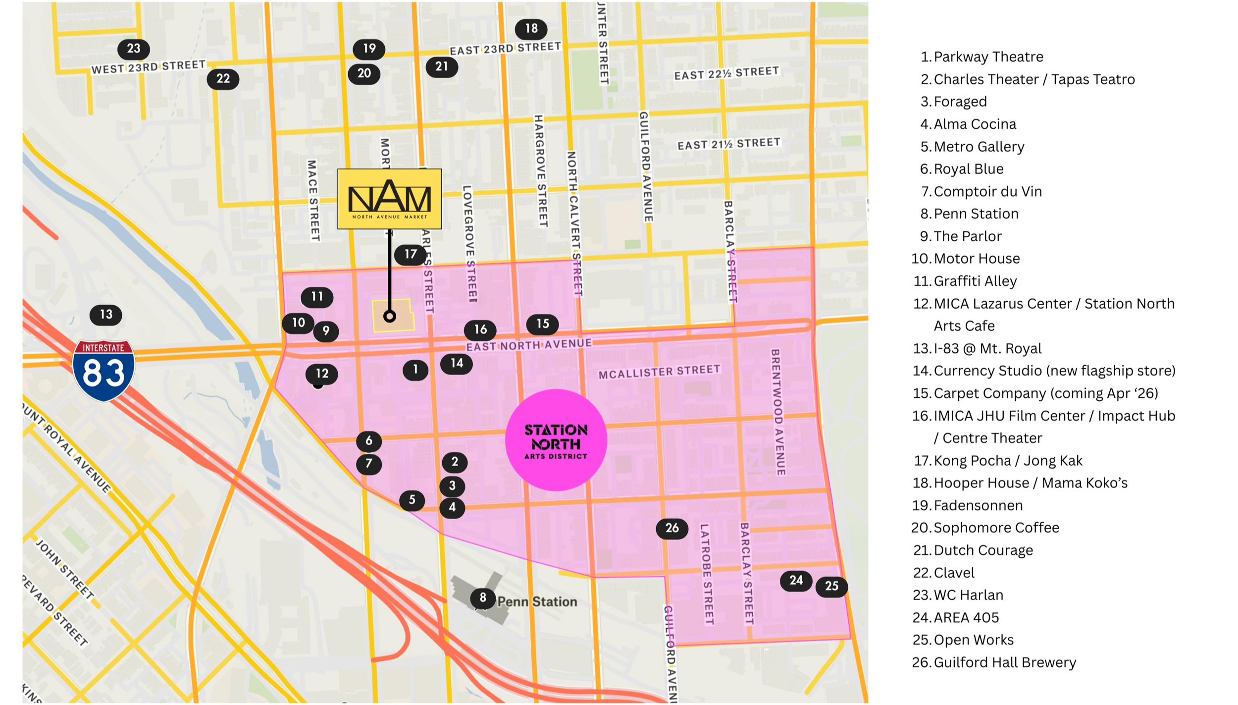 North Avenue Market has a prominent location at the geographic center of Baltimore City and within the Charles North, Station North Arts and Entertainment District.